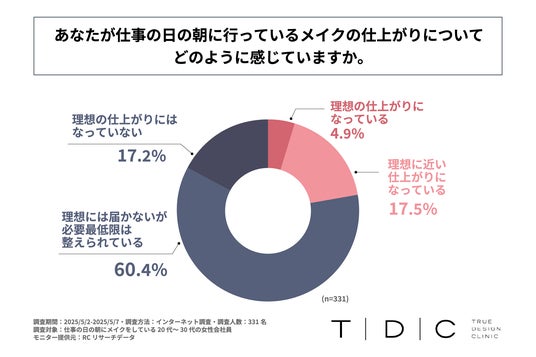 続いて、「仕事の日の朝に行っているメイクの仕上がりについてどのように感じているか」を尋ねる設問への回答では、1位が「理想には届かないが必要最低限は整えられている」で60.4%、2位が「理想に近い仕上がりになっている」で17.5%、3位が「理想の仕上がりにはなっていない」で17.2%という結果になりました。1位と3位の回答を合計すると回答率約80%となり、この結果から、20代~30代の女性会社員の約8割が、仕事の日の朝に行っているメイクの仕上がりは理想に届いていないと感じているということが判明しました。