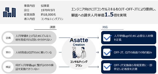 エンジニア人材を多数抱えるSIer様では、「エンジニアに対しITコンサルティングスキルを付与し人月単価を向上させる」という目的のもとOJT、OFF-JTのお取り組みを実施し、人月単価1.5倍を実現いたしました。