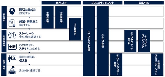 広く職種に共通する仕事の進め方である、目的設定→伝達事項整理→伝達・推進というプロセスについて、DXスキルと平行し思考スキル、伝達スキル、プロジェクトマネジメントスキルの獲得を目的として人材育成を行います。