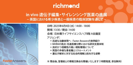 主催者であるRichmond Pharmacologyは、革新的な遺伝子治療の実現を支えるイギリスのCROです。Intellia社との共同試験では、ATTRアミロイドーシスを対象としたCRISPR-Cas9治療薬NTLA-2001を世界で初めて患者に投与し、臨床開発史に新たな一歩を刻みました。