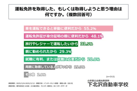 次に、普通自動車免許を取得しているか、今後取得する意向があると回答された方に「運転免許を取得した、もしくは取得しようと思う理由」を問う設問の回答では、1位が「車を運転できると移動に便利だから」で55.2%、2位が「運転免許証が身分証明の際に便利だから」で48.1%、3位が「旅行やレジャーで運転したいから」で33.5%という結果になりました。また、4位以降も回答率20%を超える回答が複数並ぶ形となり、この結果から、運転免許を取得した、もしくは取得しようと思う理由は様々あることがわかりました。