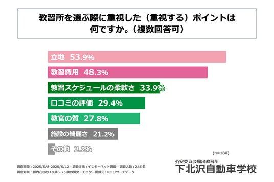 次に、運転免許を自動車教習所で取得した、または今後取得したいと回答された方に「教習所を選ぶ際に重視した(重視する)ポイントは何か」を尋ねる設問への回答では、1位が「立地」で53.9%、2位が「教習費用」で48.3%、3位が「教習スケジュールの柔軟さ」で33.9%という結果になりました。また、4位以降も回答率20%を超える回答が複数並ぶ形となり、この結果から教習所を選ぶ際に重視するポイントは多岐に渡ることがわかりました。