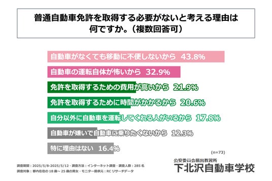 調査の最後、普通自動車免許を持っておらず、今後取得する予定もないと回答された方に「普通自動車免許を取得する必要がないと考える理由」を尋ねる設問の回答で多かったのは、1位が「自動車がなくても移動に不便しないから」で43.8%、2位が「自動車の運転自体が怖いから」で32.9%、3位が「免許を取得するための費用が高いから」で21.9%という結果になりました。この結果から「自動車がなくても移動に不便しないこと」が普通自動車免許を取得しない最大の理由であることが明らかになりました。