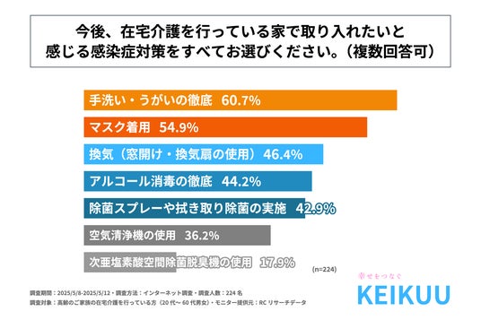 調査の最後、「今後、在宅介護を行っている家で取り入れたいと感じる感染症対策」を尋ねる設問の回答で多かったのは、1位が「手洗い・うがいの徹底」で60.7%、2位が「マスク着用」で54.9%、3位が「換気(窓開け・換気扇の使用)」で46.4%という結果になりました。また、4位以降も回答率40%を超える回答が複数並ぶ形となり、この結果から、今後、在宅介護を行っている家で取り入れたいと感じる感染症対策は様々あることがわかりました。