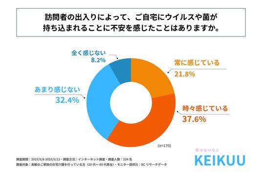 また、自分以外に在宅介護を行っている家に出入りする人がいると回答された方に「訪問者の出入りによって、自宅にウイルスや菌が持ち込まれることに不安を感じたことがあるか」を尋ねる設問への回答では、1位が「時々感じている」で37.6%、2位が「あまり感じない」で32.4%、3位が「常に感じている」で21.8%という結果になりました。1位と3位の結果を合計すると回答率約60%となり、この結果から約6割の人が訪問者の出入りによって、自宅にウイルスや菌が持ち込まれることに不安を感じたことがあることが明らかになりました。