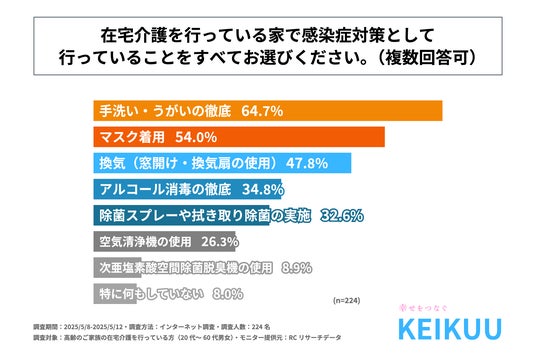 また、「在宅介護を行っている家で感染症対策として行っていること」を尋ねる設問への回答では、1位が「手洗い・うがいの徹底」で64.7%、2位が「マスク着用」で54.0%、3位が「換気(窓開け・換気扇の使用)」で47.8%という結果になりました。また4位以降も回答率30%を超える回答が複数並ぶ形となり、この結果から、在宅介護を行っている家で行われている感染症対策は多岐に渡ることが判明しました。