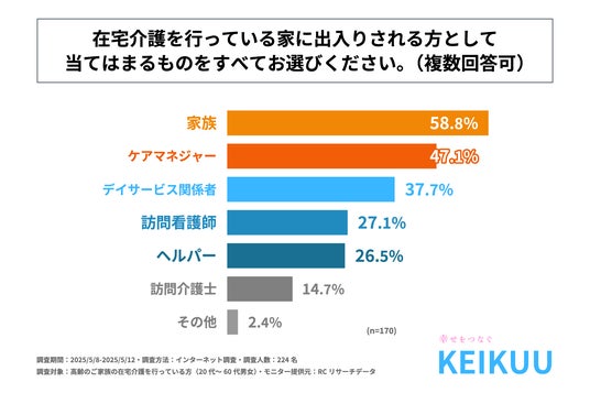 続いて、自分以外に在宅介護を行っている家に出入りする人がいると回答された方に「在宅介護を行っている家に自分以外で出入りする人」を尋ねる設問の回答では、1位が「家族」で58.8%、2位が「ケアマネジャー」で47.1%、3位が「デイサービス関係者」で37.7%という結果になりました。また、4位以降も回答率20%を超える回答が複数並ぶ形となり、在宅介護を行っている家に出入りする人は様々な人がいることが判明しました。
