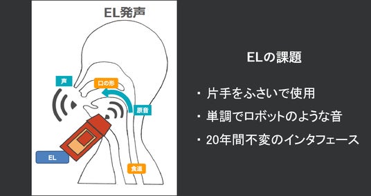 声を取り戻す方法の1つとして電気式人工喉頭(EL)と呼ばれる機械があります。円筒状のデバイスのボタンを押すと先端が振動し、この振動部を首に当てることで声が出ます。しかし、ELを使って話すと片手がふさがります。しかも単調でロボットみたいな音しか出ません。またこの円筒状のデザインは20年以上変わっていないのです。