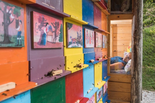 「養蜂箱アート(巣箱の絵画)」は、18世紀のスロベニアで生まれた独自のフォークアートです。木製の巣箱の前面パネルに、ユーモラスなものや宗教的なモチーフなど、さまざまな絵がカラフルに描かれ、養蜂家たちはこのアートを通じて巣箱を見分けたり、自身の文化や信仰、物語を表現してきました。このユニークな伝統は、現在ではスロベニアの無形文化遺産として認識されており、養蜂との深いつながりと自然との共生を象徴しています。近年では、展示やお土産品としても人気を集めています。