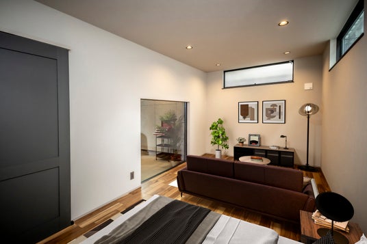 主寝室をセカンドリビングとしてデザイン。フラットにつながる窓からガレージが一望できます。(画像は一部CG加工)