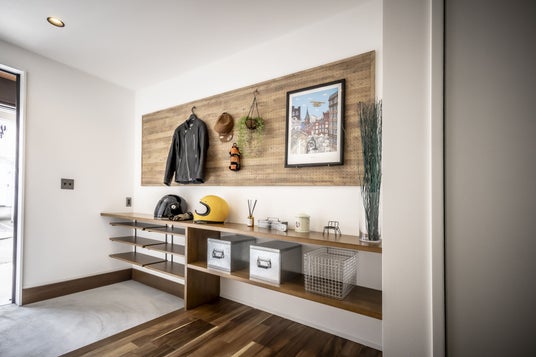 玄関には有孔ボードを大胆に配置。自分らしさを表現するギャラリースペースに。