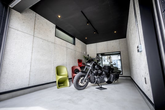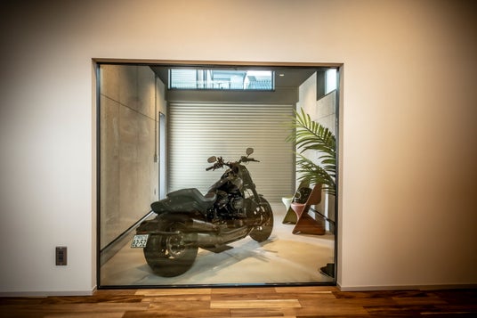 部屋からライトアップされた愛車が見える間取りや、使い勝手にこだわったガレージ、スイッチなどの細かな部材、それぞれがバイク乗りの琴線にふれる住宅に仕上がっています。