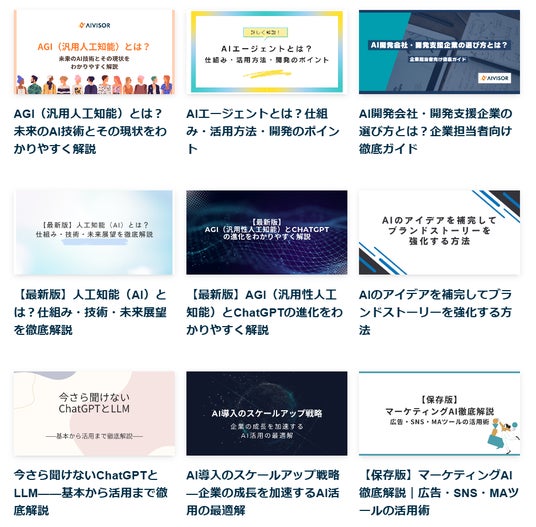 AIVISORでは今後、AI導入の導入・活用事例を増やすとともに、業界別の導入傾向や市場分析など、より高度なインサイトを提供する特集コンテンツも展開予定です。また、セミナーやウェビナーとの連携も視野に入れ、AI導入支援を多角的に強化してまいります。