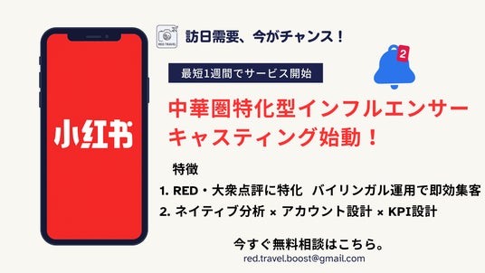 「RED BOOST」は、飲食店・宿泊施設様向けに小紅書(RED)と大衆点評でのインフルエンサー(KOL/KOC)キャスティング・投稿設計・効果測定 をワンストップで行います。