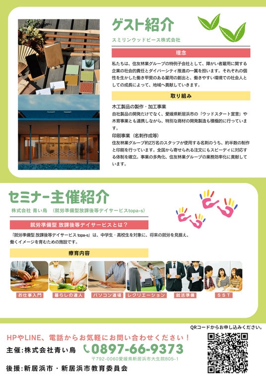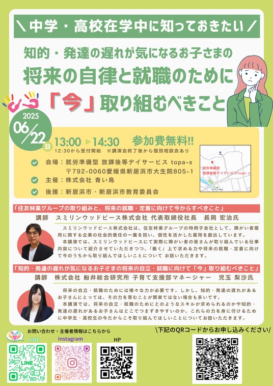株式会社 青い鳥(所在地:愛媛県新居浜市、代表取締役:白石 真奈美)が運営する就労準備型 放課後等デイサービスtopa-s(トパース)は、2025年6月22日(日)に、知的・発達の遅れが気になる小学校高学年~高校生のお子様を持つ保護者様および関係機関の皆様を対象とした無料講演会を開催いたします。