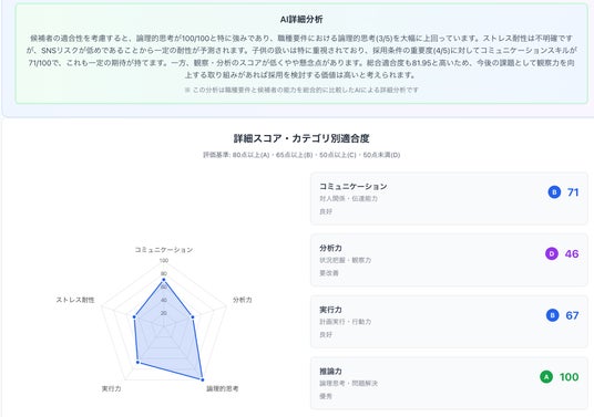 『適採眼』は、こうした課題に対し、AIを使った性格傾向・適性の分析と、現場ニーズとのマッチング判定を可能にすることで、採用の質と定着率の両方を高める新しいツールです。