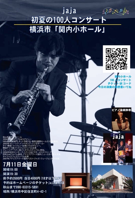 湘南のカフェから、次は横浜の音楽ホールへ。7月11日(金)、関内ホール・小ホールにて、jaja初の「初夏の100人コンサート」が開催されます。