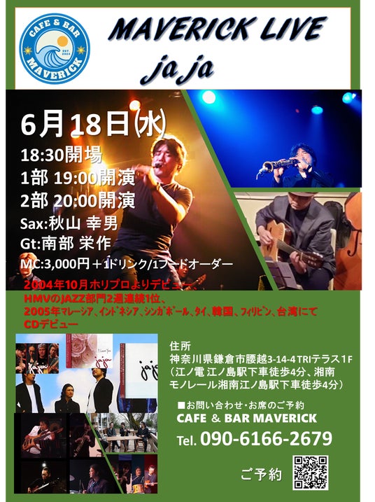 6月18日(水)には、Cafe & Bar MAVERICKでjajaライブを開催。江ノ電がすぐそばを走る、唯一無二の空間で第1部19:00~/第2部20:00~の2部構成。飛び入りセッションも歓迎で、観客と演者がひとつになる夜を演出します。