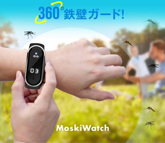 このたび、クラウドファンディングプラットフォーム「CAMPFIRE」にてプロジェクトを公開した「MoskiWatch(モスキウォッチ)」 は、超音波により身の回りに360°の見えないバリアを張って蚊などの虫を寄せ付けない、多機能スマートバンド型デバイスです。人間には聞こえない音波で半径約1.5mの範囲をカバーし、不快な蚊を遠ざけます。