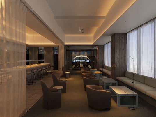 「要素を削ぎ落とす事から導き出される無駄の無いデザイン」をテーマに、このラウンジに必要とされる機能を吟味しながらレイアウトを行いました。開放的な空間を意識し、奥に行くほどゆったり心地よく滞在できる要素を配置しました。間仕切りを設けず、間を設けたり目線を変えるなど、旅行中の滞在者が居心地よく過ごせる空間を目指しました。空間を構成するマテリアルには、再生 素材を用いるなど、シンプルな構成ながらも随所に素材の表情が伺える空間となっています。環境 にも配慮したサスティナブルな考えが訪れた皆さまにも伝わり、持ち帰っていただけることを願います。
