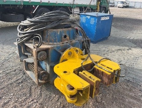 今回の発明は、従前のバイブロハンマ引き抜き工法で使用していた杭把持装置に、新たに製作した杭抜き補助具を取り付けることで、杭の破損を防ぎ、より安全に杭を把持し引き抜くことを可能にします。主な特徴は以下の通りです。