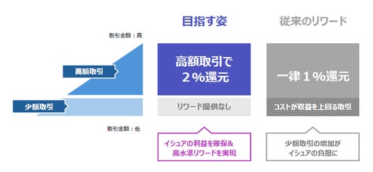 この度の新システムは、イシュアにとって最も重要な収益源であるショッピング手数料とユーザーへのリワードを連動させることが特徴です。イシュアの利益を確保しながらリワードの提供を行うため、イシュア・ユーザーそれぞれにとっての課題を解決することができます。取引毎にインターチェンジフィーとリワードがどのように連動しているかをユーザーに提示することもでき、ユーザーにとってもリワードの根拠を知ることができる透明性の高いサービスとなります。