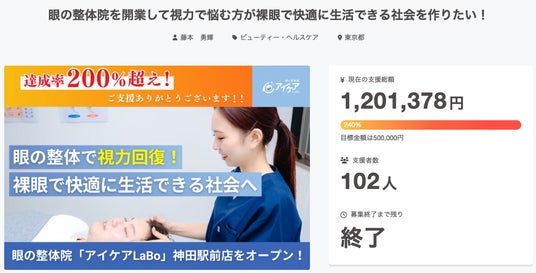 クラウドファンディングプラットフォームCAMPFIREにて挑戦中の「眼の整体院『アイケアLaBo 神田駅前店』開業プロジェクト」が、皆様からの多大なるご支援により、目標金額50万円を大きく上回る1,201,378円|支援者102名(達成率240%)*を超えて達成いたしました。