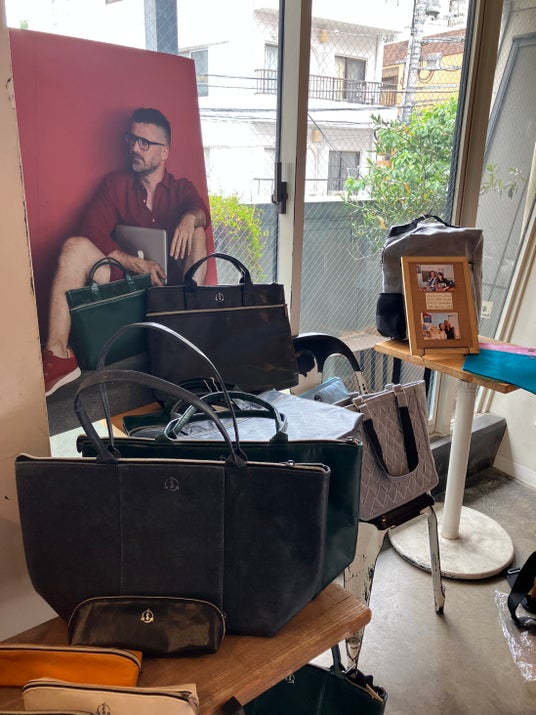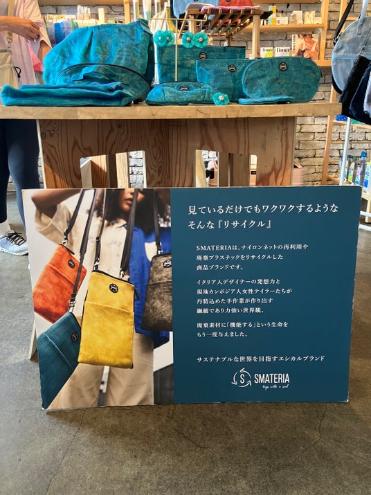 「エシカルな価値観と多世代のつながり」をテーマにした今回のポップアップイベントでは、SMATERIAのバッグやポーチなどが多数展示・販売され、五反田の街に彩りを添えました。