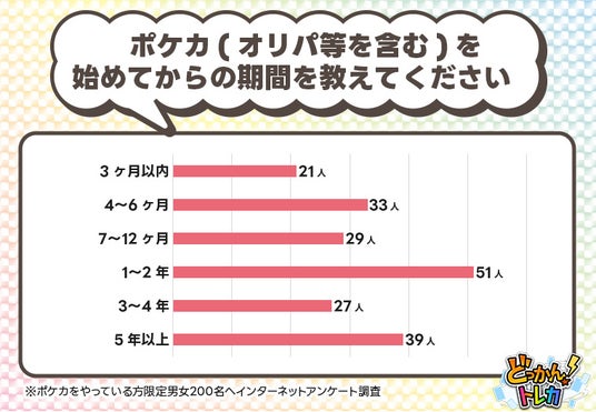 ポケカ(オリパ等を含む)を始めてからの期間を調査した結果、始めてから3ヶ月以内の方から5年以上の方まで、幅広い利用期間の方がいることが明らかになりました。
