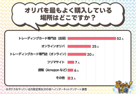 オリパを最もよく購入している場所の調査では、トレーディングカード専門店の店頭で購入している方が最多という結果になりました。