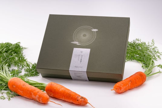 蓋の表面には、人参の断面を抽象化した図案をモチーフに使用。箱を開ける瞬間や、食べ終えた後にも余韻が残るよう、ラベル跡が残らない素材や、収納箱として再利用できる仕様を採用しています。