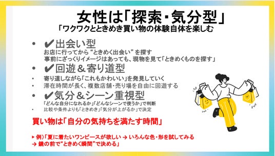 男性は即決、女性は“ときめき”女性は探索型。買い物の空間や体験、接客にの価値を感じる。そのときの気分や直感を大切にしながら、店内を回遊し、自分がときめく、最高に似合うアイテムを選んでいく。
