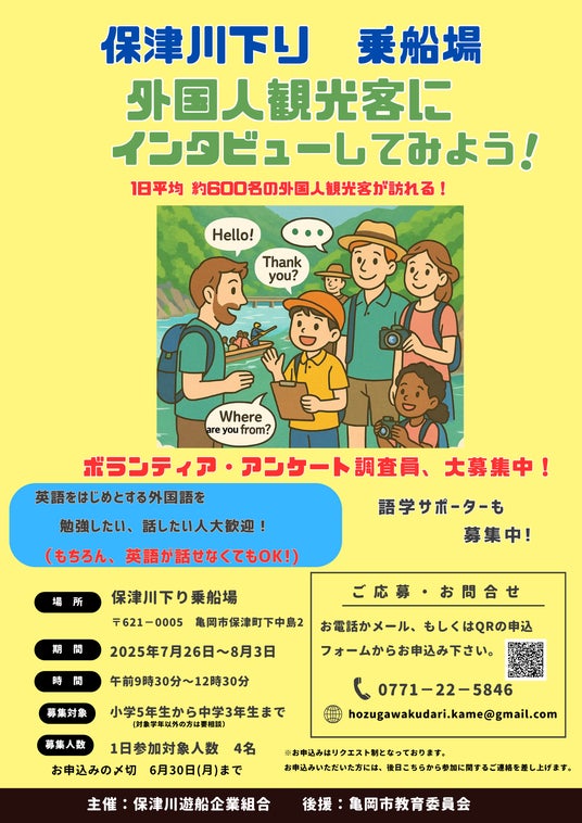京都・亀岡の人気観光スポット「保津川下り」の乗船場に、夏休み期間中、地元の子どもたちが訪日外国人観光客に英語や他言語でインタビューを行う体験活動「保津川下り乗船場・外国人観光客にインタビューしてみよう!」が、7月26日(土)から8月3日(日)まで実施します。
