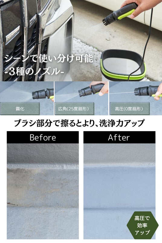 高圧、広角、霧化の3種類のノズルを搭載し、愛車の洗車から花壇や網戸の掃除まで、多用途に対応します。これ1台で家中の掃除が簡単に行え、外回りやベランダ、車のメンテナンスにも最適です。