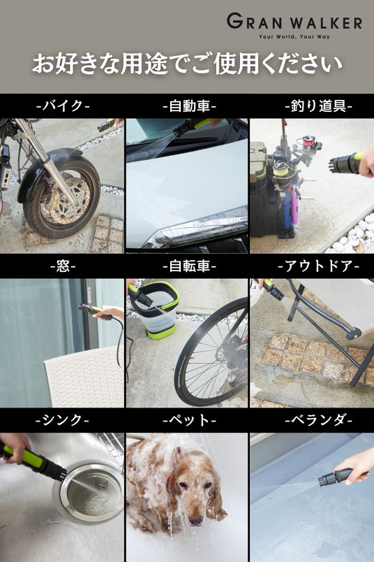 これまでの高圧洗浄機は、電源と水道が必須で、さらに使い終わった後の収納に手間がかかりました。しかし、「グランウォーカー マルチクリーナー ポータブルジェット」は、USB充電と水道ホース不要を実現し、従来の制約を完全に取り払いました。キャンプや洗車、ベランダ掃除、お墓掃除など、どんな場所でも場所を選ばず活用できる次世代の洗浄機です。