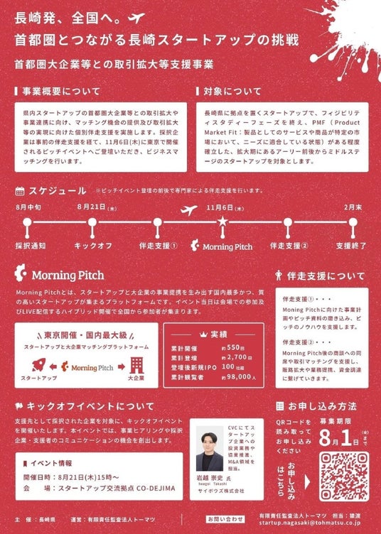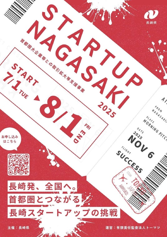 長崎県では、県内スタートアップの首都圏大企業等との取引拡大や事業連携に向け、マッチング機会の提供及び取引拡大等の実現に向けた個別伴走支援事業「STARTUP NAGASAKI」を開催します。本事業で採択した企業は事前の伴走支援を経て、11月6日(木)に東京で開催されるピッチイベント「Morning Pitch(http://morningpitch.com/)」へご登壇いただき、ビジネスマッチングを行います。