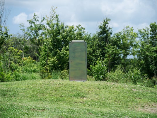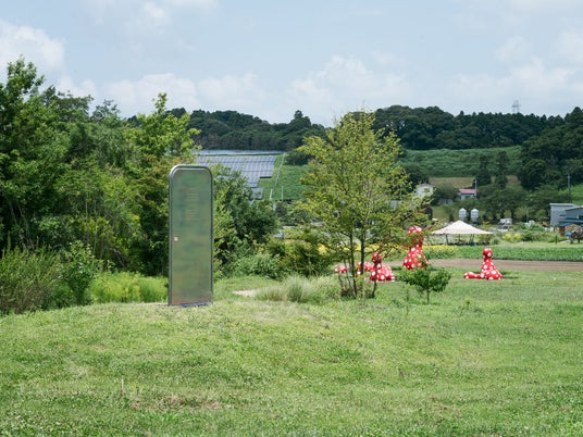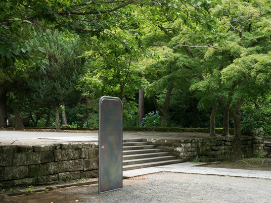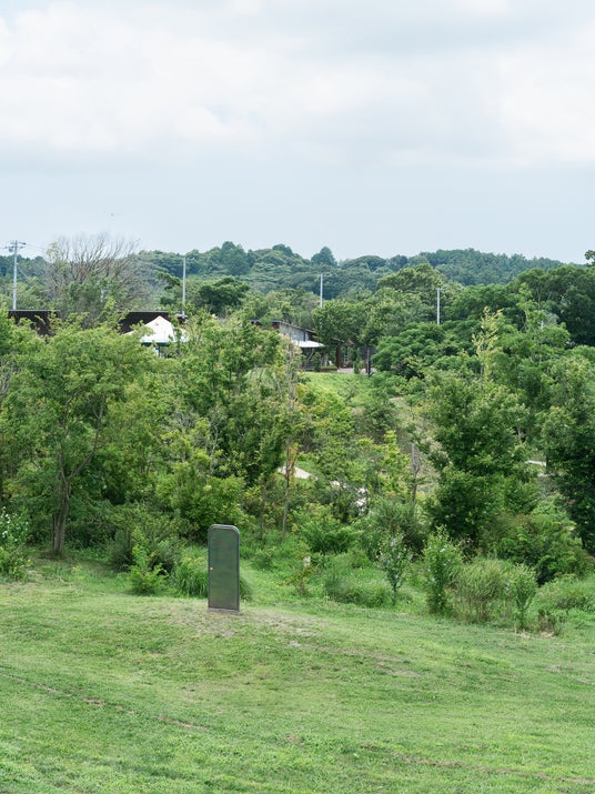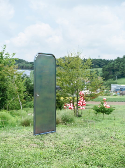 *《Anywhere Door》木更津・KURKKU FIELDS での写真。常設作品として園内に展示されることになった。鉄筋コンクリー ト基礎をつくり設置された。作品への近づきやすさや園内での見え方も考慮された。背後には緑が生い茂る。(写真:田中克昌)
