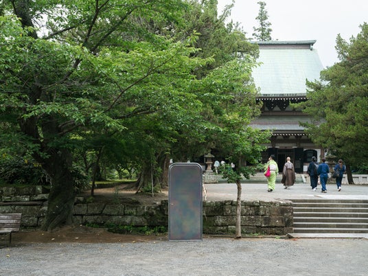 *《Anywhere Door》北鎌倉・臨済宗大本山円覚寺での写真。文化庁から許可を得て、鎌倉市文化財課立ち会いのもと、 少なくとも江戸時代頃から一度も掘削されていない山門のある広場に枕木で仮設基礎をつくり設置された。(写真:田中克昌)