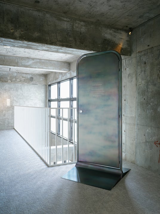 *《Anywhere Door》前橋・白井屋ホテルでの写真。常設作品としてヘリテージタワー内に展示されることになった。4箇所で唯一の屋内設置作品。床仕上面と自然につながるよう工夫し作品と一体化した脚部を設計し設置された。(写真:田中克昌)