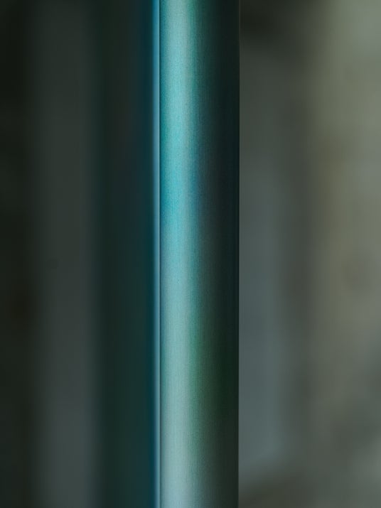 扉枠は直径38mmのステンレス丸パイプを外皮としてステンレス丸パイプの2重構造とし、扉本体の端部は R 加工として、扉と枠が一点で接する収まりとしています。扉が回転するヒンジ部分は切り込みを入れ外皮がそのまま回転する意匠とし、扉枠は平滑に収めています。また、ビスは1本も使用せず、溶接のみで組み立てを行っています。仕上げはステンレスヘアラインを残しつつ、5色使用した塗装を職人の手作業で施しています。
