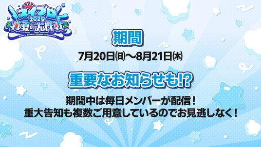 - “この夏、何かが起こる?” あらたな重大告知にも注目実は今回の企画、ただの配信リレーでは終わりません──期間中には、スイプロにとって大きな転機となる“発表”も予定されています。いつ、どんな形で明かされるのかは未定ですが、配信を見ていく中で、そのヒントが少しずつ明らかになるかもしれません…!
