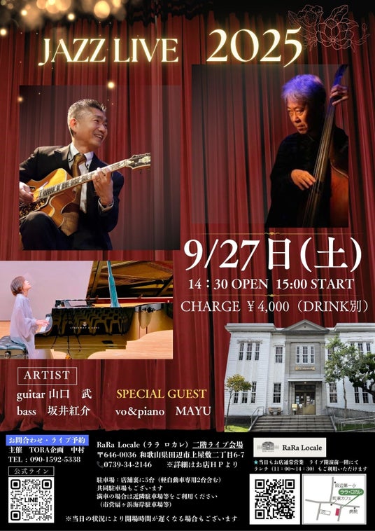 TORA企画は昨年に引き続き、2025年9月27日(土)に和歌山県田辺市「RaRa Locale(ララ・ロカレ)」にて、日本を代表するジャズギタリスト山口武、ウッドベーシスト坂井紅介、そしてシンガーソングライターMAYUによるスペシャルライブ「JAZZ LIVE 2025」を開催。