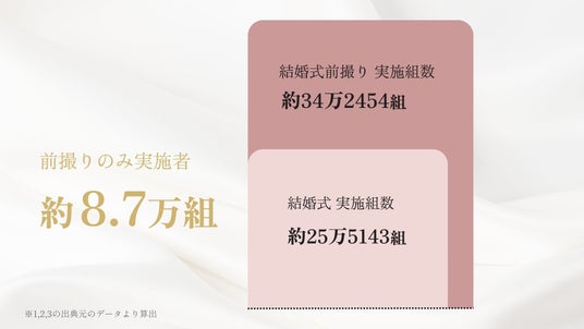 この数字をもとに計算すると、結婚式は挙げないけれど、前撮りは行うカップルが約8.7万組もいることになります。
