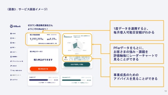 01Bankは、SaaSを通じて中小事業者のビジネスを支援する事業者(以下、プラットフォーマー『PFer』)と連携することで、こうした質の高い「データ」から中小事業者のビジネス上の活動実態を的確に把握し、融資審査を行う際に有効に活用してまいります。