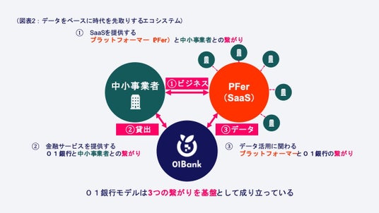 01Bankのビジネスモデルは、次の3つの繋がりを基盤として成り立っています。1.SaaSを提供するPFerと中小事業者との繋がり、2.金融サービスを提供する01Bankと中小事業者との繋がり、3.データ活用に関わるPFerと01Bankの繋がり、の3つです。中小事業者、PFer、01Bankの3者は「データをベースに時代を先取りするエコシステム」を共創します。そのエコシステムの中で、中小事業者は普段ビジネスで利用するPFerのサービスサイト上にあるバナーから01Bankへアクセスでき、日々のビジネスの延長に01Bankが存在する、そのような銀行を目指します。