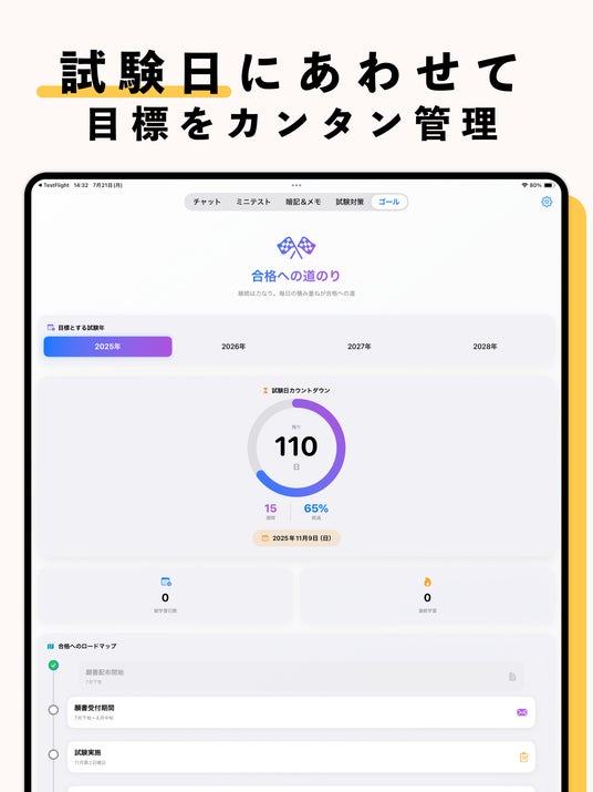・試験日カウントダウンとロードマップで学習ペースを可視化