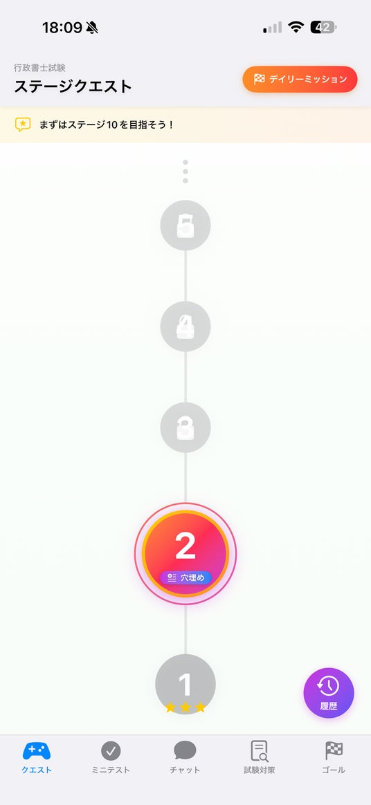 ・デイリークエスト機能:毎日のスキマ時間で4択問題と多肢選択問題に挑戦が可能です。不正解になった問題はそのまま暗記カード登録して復習可能。