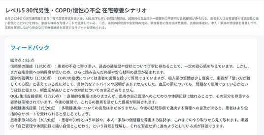 日本の在宅医療現場では、高齢患者さんの増加に伴い医療知識だけでなく、「高度な対話力」が重要となっています。しかし従来型研修は専門書などからの座学や、スタッフに協力を得るロールプレイなどが中心で、現場のニーズと乖離しがちでした。当法人は Gemini を活用し、無制限にシナリオを生成できるロールプレイ を導入することで、より現場に近い学習体験を提供します。在宅医療ロープレの強みは、実際の患者さんの診察状況を個人情報に配慮しながら記録し、医学的背景や患者背景を取り入れたことです。患者さんの実際の話し方、訴えなどをAIに学習させ、どこにいても対話力の向上が出来るようにしました。