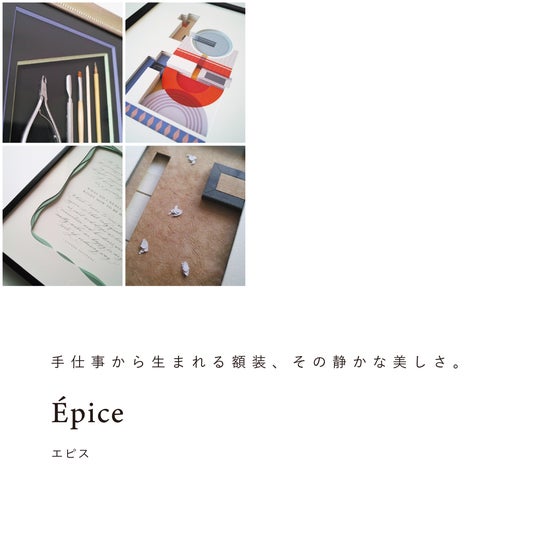 額装文化が大きく進化したルネサンス期を経て、フランスでは立体加工の技術が生まれ、奥行きとデザイン性を兼ね備えた独自の額装文化が花開いた。「Epice」では、そんなフランス額装を背景に額装を制作、販売している。代表の沖津さんが作る空間デザインの視点を通して生まれた額装は、絵画にとどまらず、文章、思い出の一品、あらゆる物の魅力を静かに、美しく、引き出す。