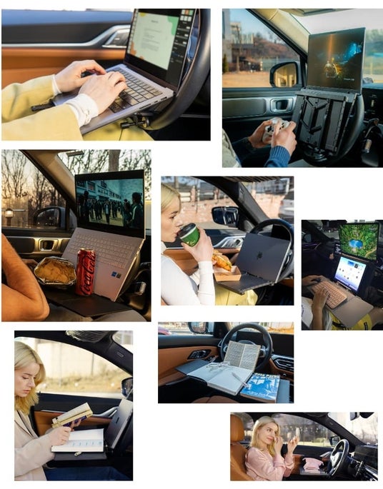 全車種対応!車のハンドルに取り付け可能な「車内テーブルCaro」。いつもの車を移動するオフィス&リビングに。海辺の駐車場でテレワーク、車内ナイトシアター等、新しいライフスタイルが広がります!